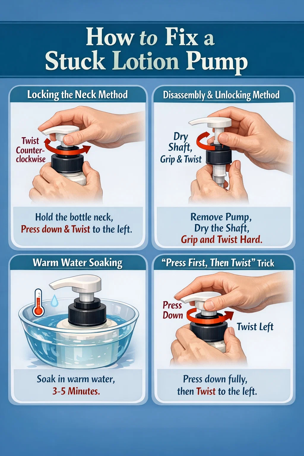 Dette er den vanligste og mest effektive metoden. Ofte dukker ikke lotionpumpen opp fordi når du roterer det øverste pumpehodet, roterer også flaskekorken under, og opphever kraften.