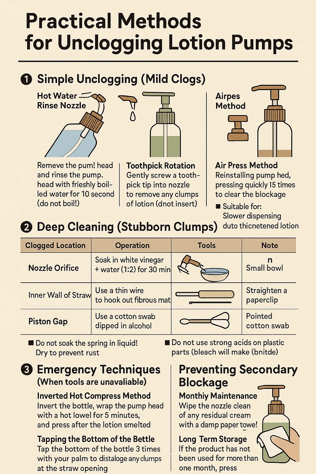 Invertert varm komprimeringsmetode: Vend flasken, pakk pumpehodet med et varmt håndkle i 5 minutter, og trykk etter at lotionen har smeltet.